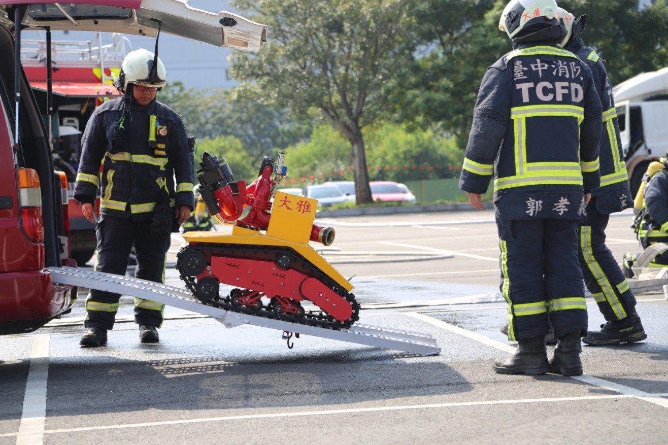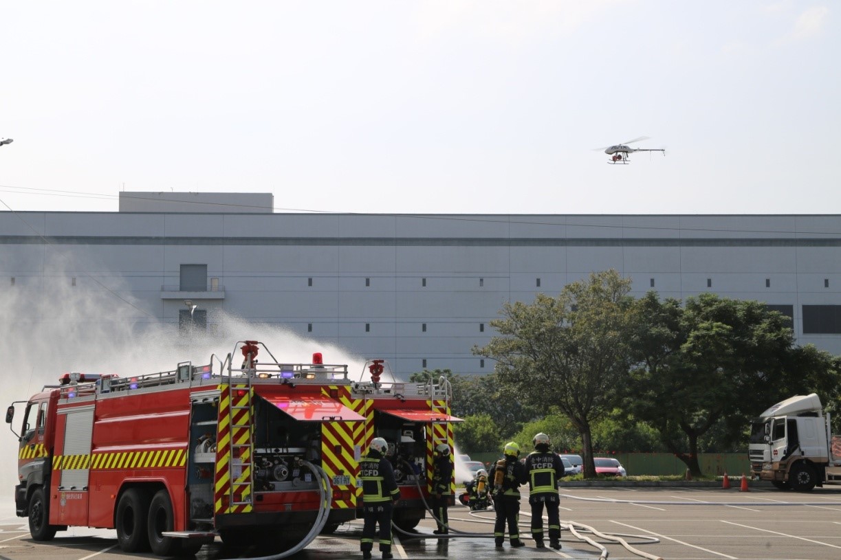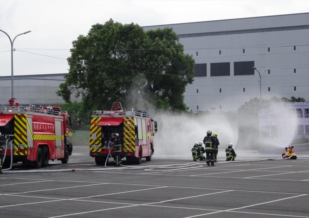 台中市政府消防局、環保局、環保署中區環境事故專業技術小組、園區保警隊及聯防廠商等共出動數十部救災車輛實施應變演練。本演練中的亮點,在科技救災利器的運用展示:台中市政府消防局出動「履帶式遙控砲塔車」,以遠端遙控方式滅火;友達光電后里廠並邀田屋科技(股)公司合作,以無人直昇機空投滅火彈方式滅火,除提高救災效率外,並避免救災人員深入火場及有毒氣體區域;全場演練共動員百餘人參演,過程逼真、應變動作確實。