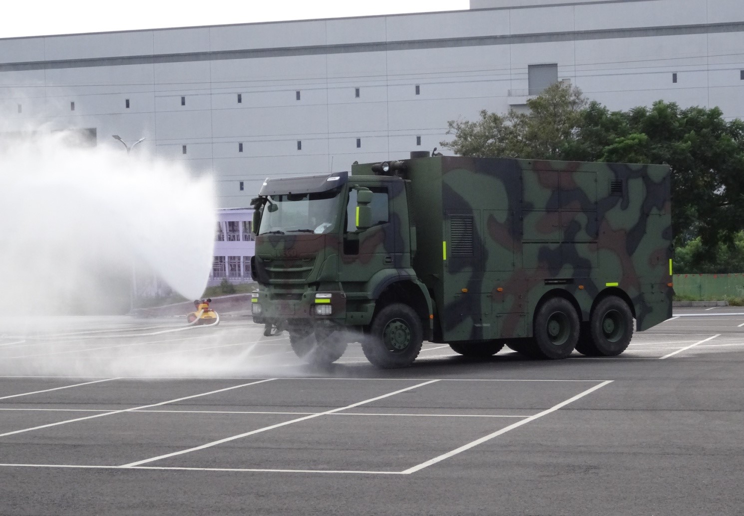 陸軍第十軍團三六化學兵群出動MD-105重型消毒車進行大區域消毒作業