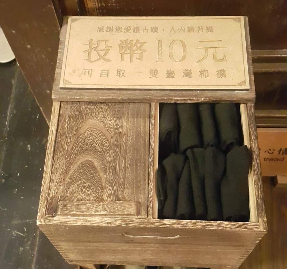 保護古蹟檜木地板,避免吸收赤腳的濕氣,青田七六貼心的為客人準備全新的襪子。