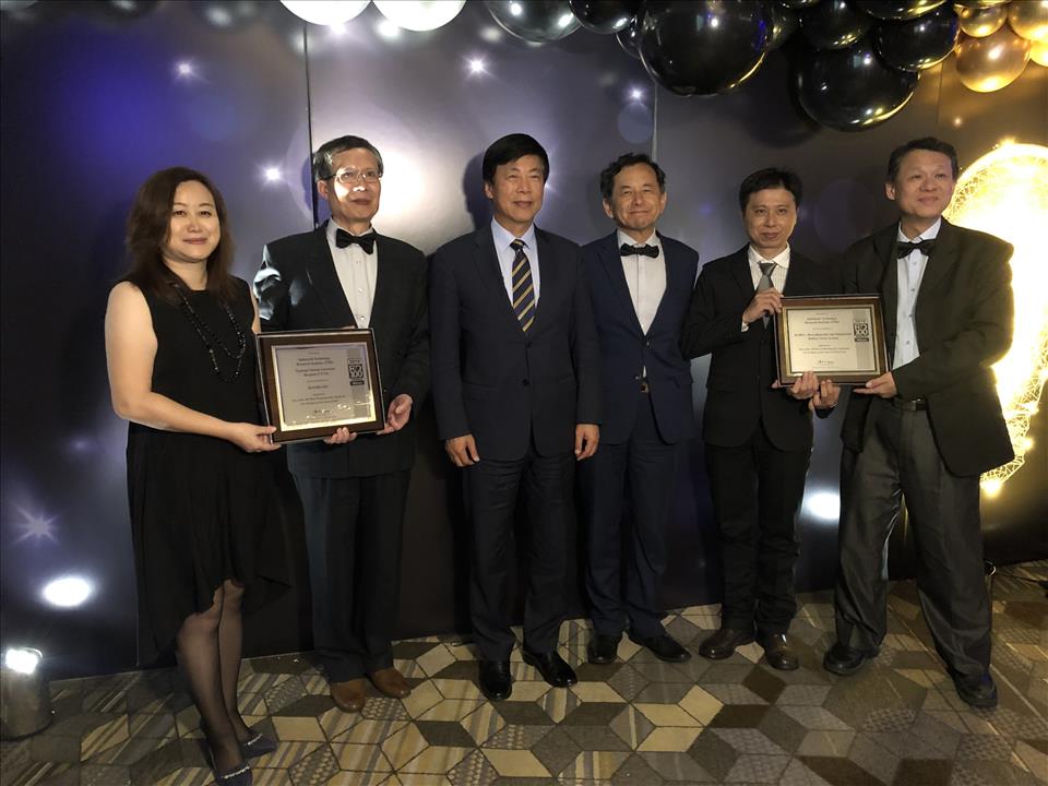 工研院研發出全球首創的「RAIBA可動態重組與自我調節之電池陣列系統」、「仿生多突狀磁珠製備技術」雙雙抱回「2019全球百大科技研發獎」,從12個美國境外獲獎的技術中勝出,研發團隊赴美領獎。(左到右為生醫所副組長江佩馨、生醫所經理陳振泰、生醫所副所長黃崇雄、資通所組長莊凱翔、資通所組長王啟龍)
