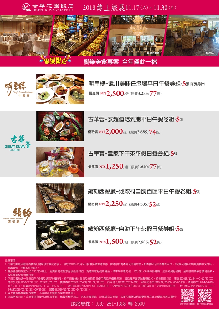 2018 ITF台北國際旅展於11月23日至26日於台北世貿中心盛大展開, 11月17日古華花園飯店線上旅展搶先開賣,絕對是超低特價,全年僅此一檔,線上旅展網址:https://kuva-chateau.ticketeasy.com.tw/。(線上旅展期間:2018/11/17-2017/11/30)