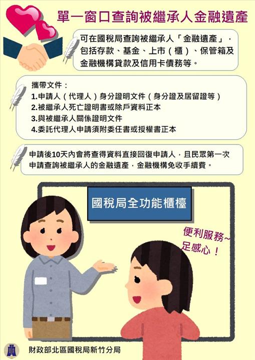 財政部北區國稅局新竹分局表示,為提供便捷、多元化之服務,強化各國稅局與金融機構間之合作機制,自109年7月1日起全國同步實施單一窗口查詢金融遺產便民措施,遺產稅之納稅義務人可就近至任一國稅局查詢被繼承人金融遺產,不受被繼承人戶籍所在地限制,國稅局受理後,將申請資料通報金融機構,由金融機構直接將查詢結果回復納稅義務人,以利納稅義務人辦理遺產稅申報。