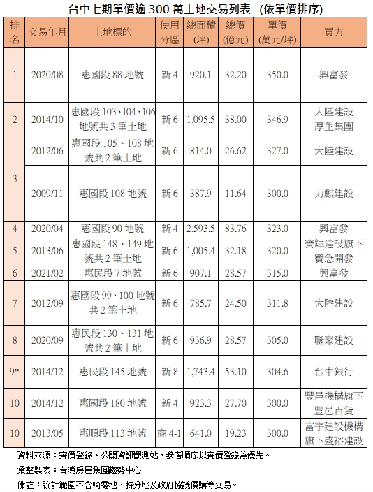 由於近年興富發、大陸建設等外地建商,接連砸下重金在七期搶地,讓台中本地建商在儲備土地庫存上,增加不少壓力,僅寶輝、聯聚等少數在地大建商,能在地價300萬/坪俱樂部中露臉。