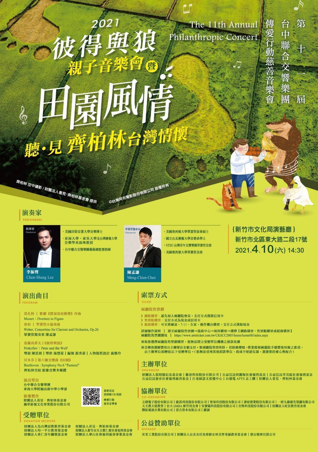 第十一屆傳愛行動慈善音樂會新竹場,將於2021年4月10日在新竹市文化局演藝廳演出「彼得與狼親子音樂會暨田園風情—聽•見齊柏林台灣情懷」,本次音樂會的受贈單位有為台灣而教教育基金會、均一平台教育基金會、普仁青年關懷基金會、看見•齊柏林基金會、新竹市天主教仁愛社會福利基金會、華山社會福利慈善基金會等,為多面向的服務挹注更多的資源和支持。