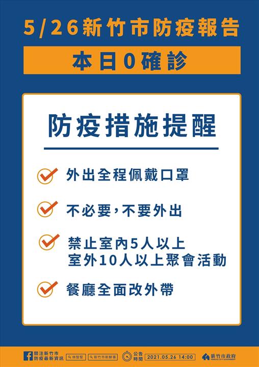 5/26新竹巿防疫報告 By - 2021/05/26 7336 5/26新竹巿防疫報告:本日0確診 防疫 延伸閱讀 遠距教學可電視上課 林智堅市長推出3億元的「防疫安心貸」助企業周轉 防疫再升級 新竹市餐廳、早餐店等明起禁止內用 臺北市政府加強版防疫專責旅館專業上線 防疫規格不鬆懈 疫情嚴峻 竹縣獨居老人關懷不打烊 老人機構防疫同步升級 疫情警戒第三級 竹縣府社會處最新防疫措施 加強獨居老人、遊民關懷 竹縣案2067、2068排除感染 齊心防疫加強稽查 為杜絕一切可能防疫破口,桃市加強稽查汽車旅館 防疫停業或照顧假之勞工薪資給付 竹市府詳說明 竹市準三級防疫準備 市長林智堅:竹市公有市場禁內用、規劃設置社區篩檢站 竹市防疫升級「準三級」 擴大社區通報篩檢、市府彈性上下班、洽公「身分證感應」實聯制