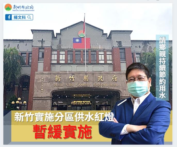 今(31日)中午中央災害應變中心宣布,由於近日滯留鋒面帶來降雨,水情稍微緩解,新竹地區水庫集水區累計降雨量超過100毫米,原訂自6月1日起新竹地區實施分區供水紅燈措施,目前決定暫緩實施。