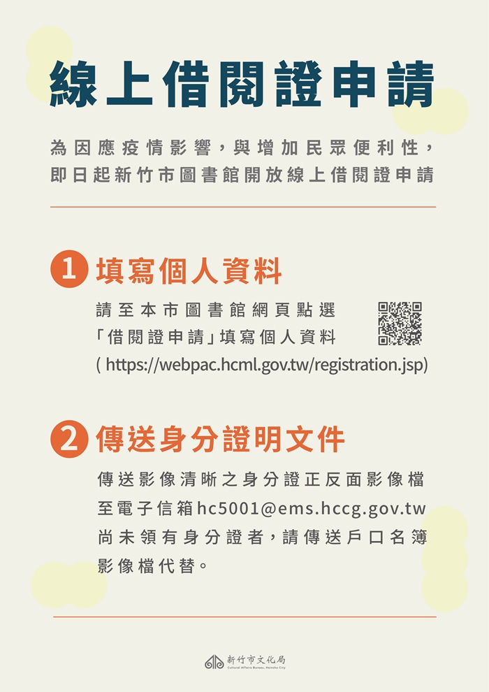 林智堅市長表示,防疫期間市民務必落實戴口罩、勤洗手、量體溫,避免群聚,而遠距上課、居家辦公也成為了防疫新日常。為了讓居家閱讀更加方便,新竹市文化局圖書館近期也優化了「線上辦證」服務,讓民眾全程在家也可申辦借閱證,迅速享受多元化的線上閱讀資源。民眾可至「新竹市文化局圖書館」網站,填寫「借閱證申請」相關資料(https://webpac.hcml.gov.tw/registration.jsp),並將身分證正、反面影像檔寄至文化局公務信箱([email protected]),即由專人協助線上辦證,讓民眾免出門、享閱讀。