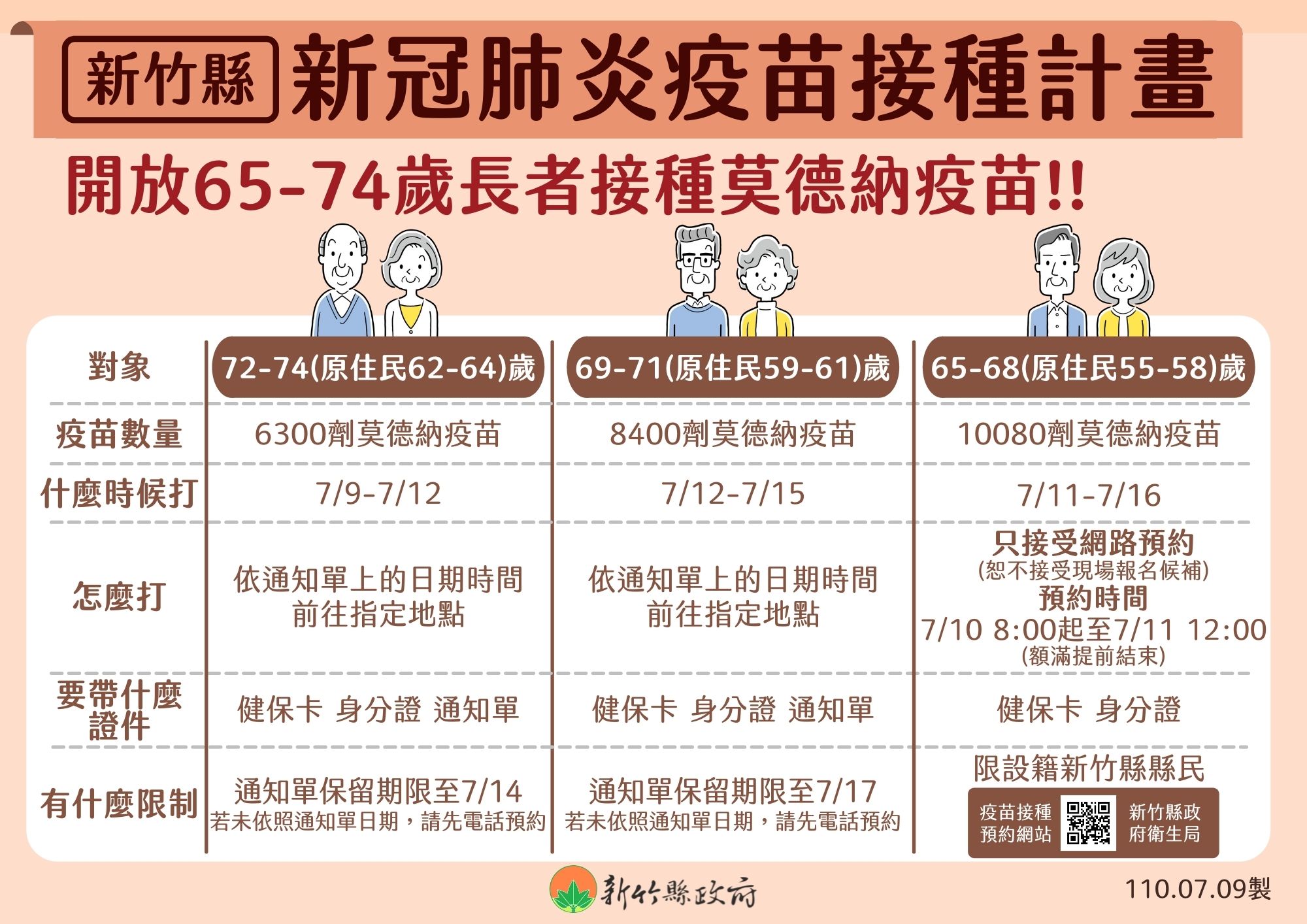新竹縣長楊文科表示,這波1萬80劑莫德納疫苗規劃在7月11至16日為設籍新竹縣的65至68歲(原住民55至58歲)長者接種,為了讓符合資格的長者能盡速施打到,將採取網路預約方式,預約時間從明天上午8時起,至7月11日中午12時為止,各接種地點額滿就停止預約,若符合資格的長者沒有預約到,未來持續撥配疫苗後,會再規劃施打。