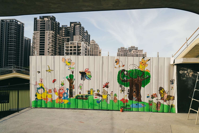 也因校舍工程目前仍持續進行中,原本校園裡單調冷漠的工程圍籬,經家長與師生共創、彩繪成校園風景一部份,充分感受到關埔國小師生的想像力與創造力,校園所有地方都是孩子的創意塗鴉空間。