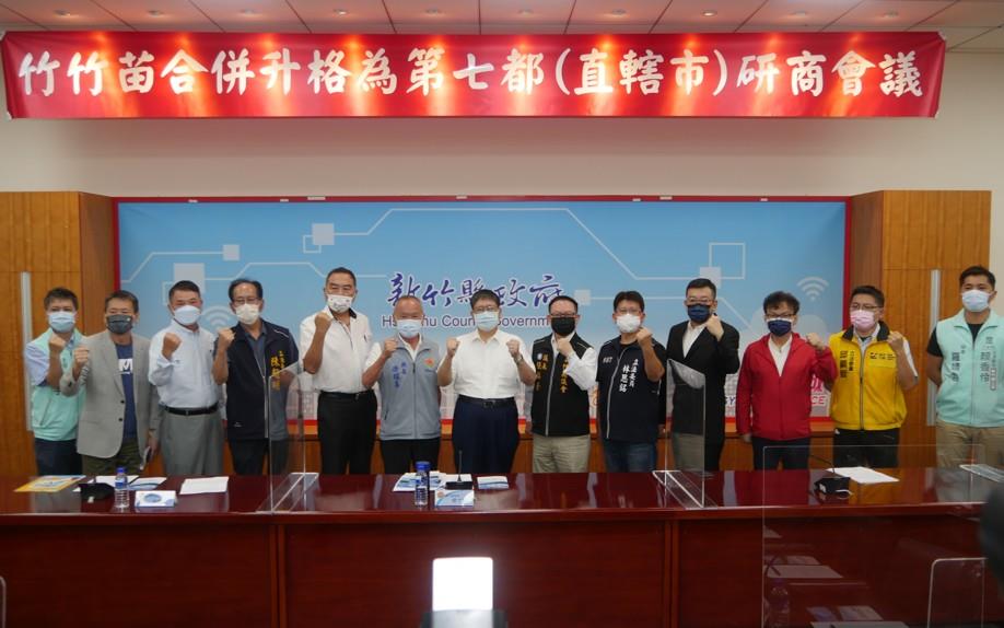 針對竹竹苗合併升格為第七都(直轄市)議題,新竹縣長楊文科今天(11日)邀請竹竹苗3縣市首長、議長和立委開會研商,提出倡議的新竹市長林智堅則未出席。會中苗栗縣長徐耀昌、3位議長和立委們皆表達想法,會後達成6點共識,包括共同譴責執政黨想為特定人士量身定做、因人設事,違背法治精神與程序正義;研議成立升格第七都直轄市推動委員會,請三縣市長、議長、立法委員為當然成員。