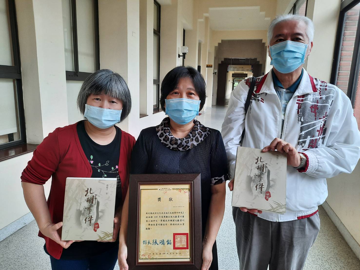 楊鏡汀校長女兒楊毓雯(中)表示,《北埔事件研究》是父親投入40餘年心血所出版的書籍