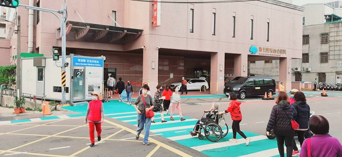 新竹國泰醫院緊臨中華路,上下班車流量大,且居民車輛進出頻繁,因此參考東山街成功案例採用標線人行道明確劃出行人空間,讓行人及等候公車的民眾有安全的庇護空間,尤其行動不便的就醫民眾更是受惠,不用再走在車道上,與車爭道而擔心害怕。