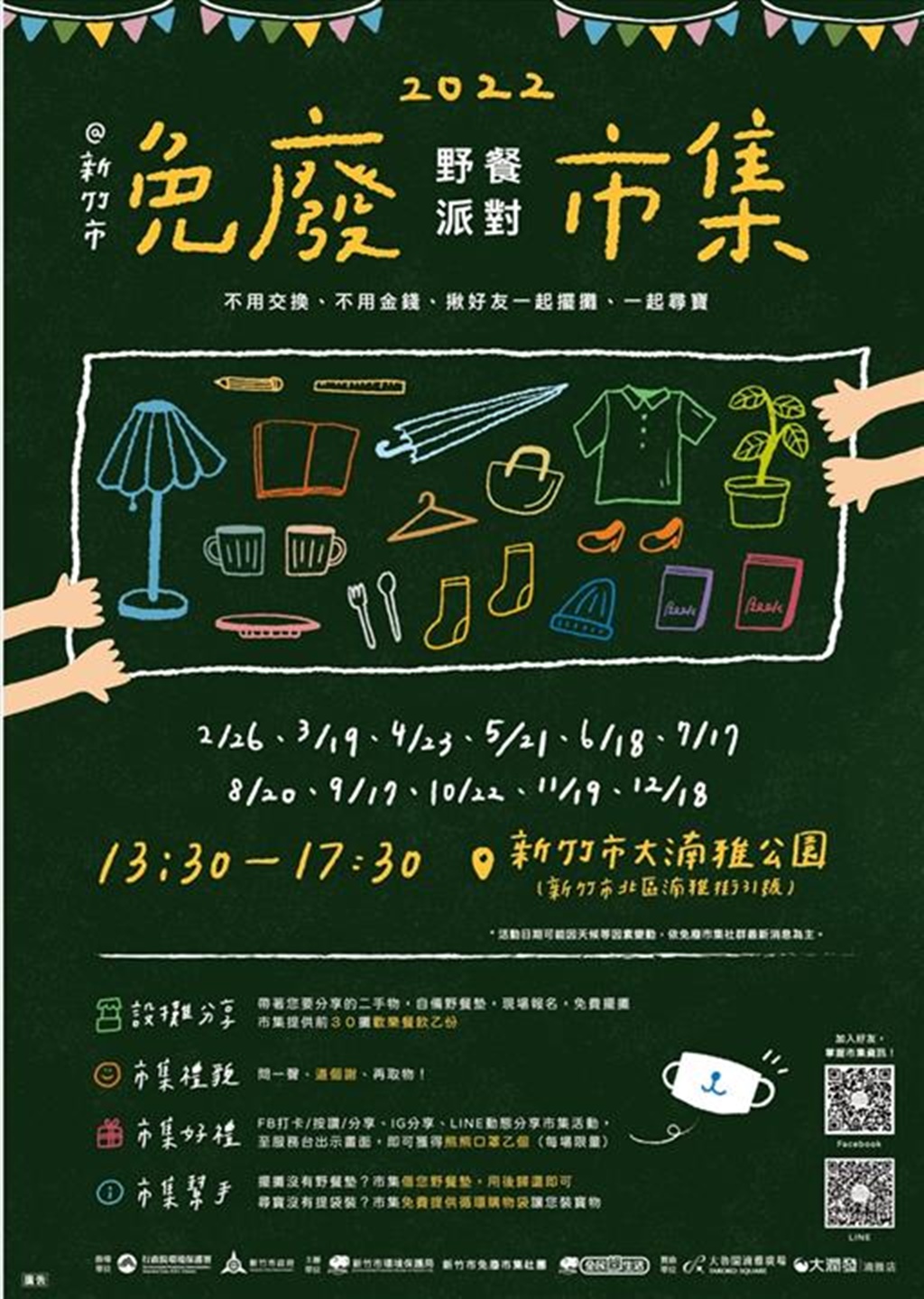 整頓住家,挖出許多美好的「不用品」,丟也不是,留也不是?連日降雨,周末將迎來好天氣,為讓不用品延續生命,新竹市環保局於2月26日(六)下午1時30分,在大湳雅公園走道兩側,熱鬧開辦「免廢市集‧野餐派對」第1場,不用交換、不用金錢,在公園綠地、音樂飛揚中,就可開心分享二手物,今(111)年共計辦理11場。歡迎市民揪親朋好友一起擺攤、一起尋寶,加入惜物愛地球的行列。只要自備野餐墊,將欲分享的二手物帶來擺攤即可,每場前30個攤位可獲得派對餐飲乙份。