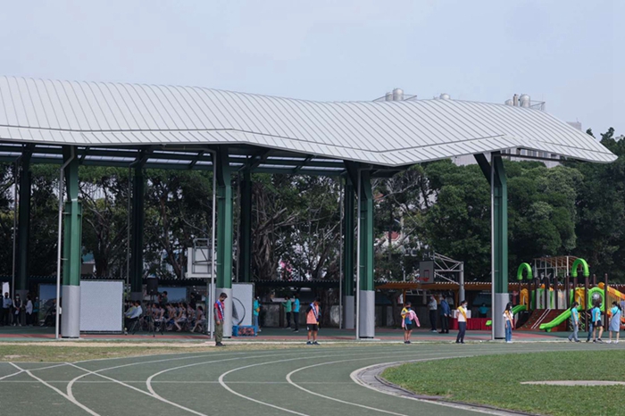 教育處說明,民富國小使用彎曲弧面將風雨球場串連校舍到操場,自然融入校園榕樹群,打造成「樹海裡的大落葉」,為學童遮陽擋雨;建功國小風雨球場屋頂設計為兩片交錯、微微脫開,不只完美阻絕雨水潑入,更打造出一道長型的透光天花板,引進光線與新竹風,更體現建築美感;而載熙國小的球場棚頂設計,則像是曬米粉被風吹拂過的形狀曲線。