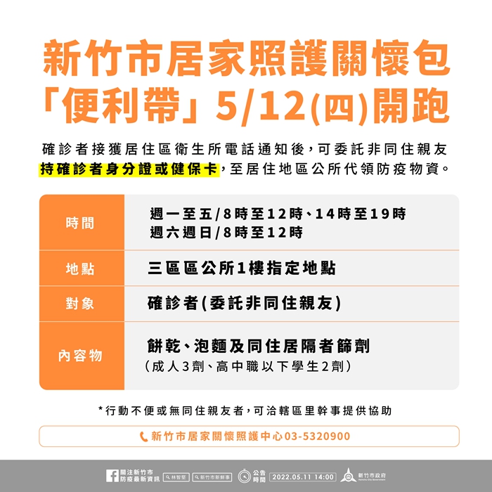 新竹市長林智堅今(11)日宣布,新竹市明日開始啟動「確診關懷包便利帶」服務,開放「確診者」親友至區公所代領防疫物資,確診者之同住者的快篩試劑(成人3劑、高中職以下學生2劑)也可一併領取。只要確診者接獲衛生所關懷電話通知或收到CDC門號0911-514588發送的確診簡訊,即可委託親友至居住地區公所領取關懷物資,即領即用最便利!