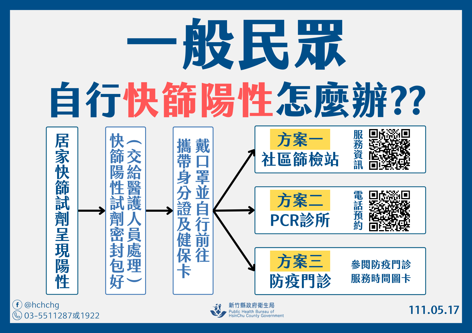 2、一般民眾自行快篩陽性可至本縣採檢診所、5家醫院開設的防疫門診或社區篩檢站接受公費PCR採檢: