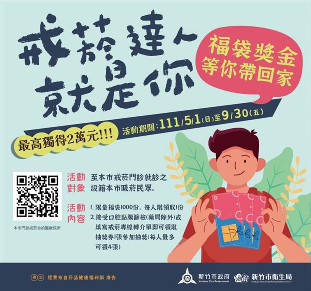 5日31日是世界無菸日,為協助癮君子戒菸,即日起,除了至合約之醫事機構或藥局接受戒菸服務,免收戒菸輔助用藥部分負擔費用,新竹市衛生局結合轄內48家戒菸門診,辦理送福袋、抽萬元活動,即日起至9月30日,設籍本市市民至本市戒菸門診接受專業服務,在就診第二次時即可領取戒菸宣導品福袋,限量1000份,若接受口腔黏膜篩檢,則可參加最高獎項為2萬元禮券的抽獎。