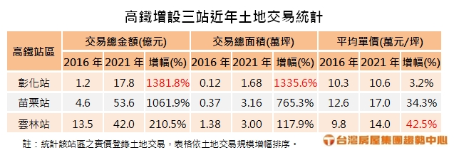 近年屏東、宜蘭都爭取高鐵延伸,盼藉由便捷交通帶動地方發展,從苗栗、彰化及雲林的新增三站經驗來看,高鐵的軌道經濟效益確實雄厚!台灣房屋集團根據實價登錄資料,統計苗、彰、雲等「高鐵新三站」的站區土地交易,與通車後第一年的2016年相較,全數價量齊揚!其中彰化站去年土地交易總金額約17.8億元、總面積達1.68萬坪,皆是2016年的13倍以上,增幅居新三站之最!雲林站則奪下新三站的地價漲幅冠軍,2021年土地平均單價達14萬元,六年間價漲42.5%。