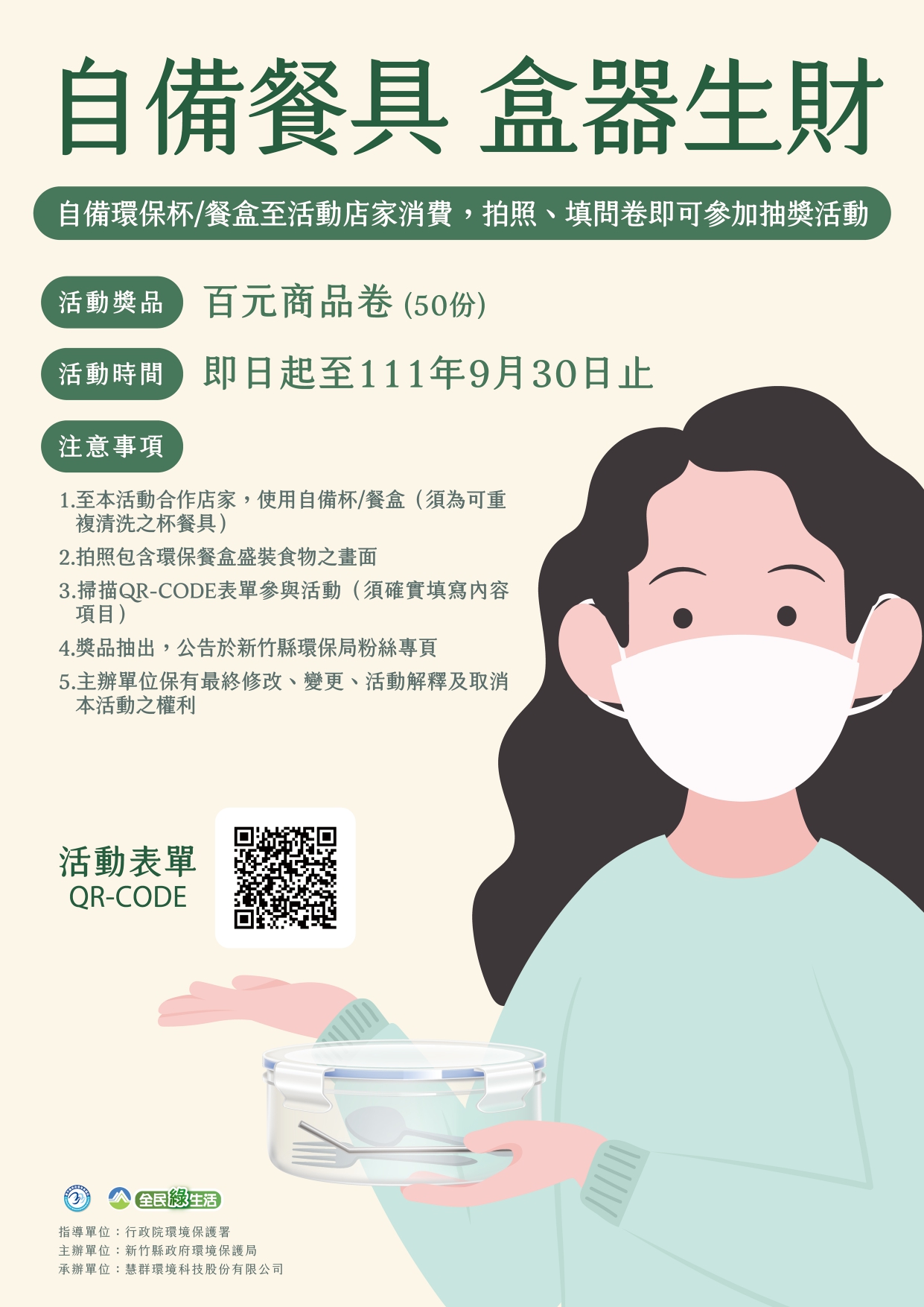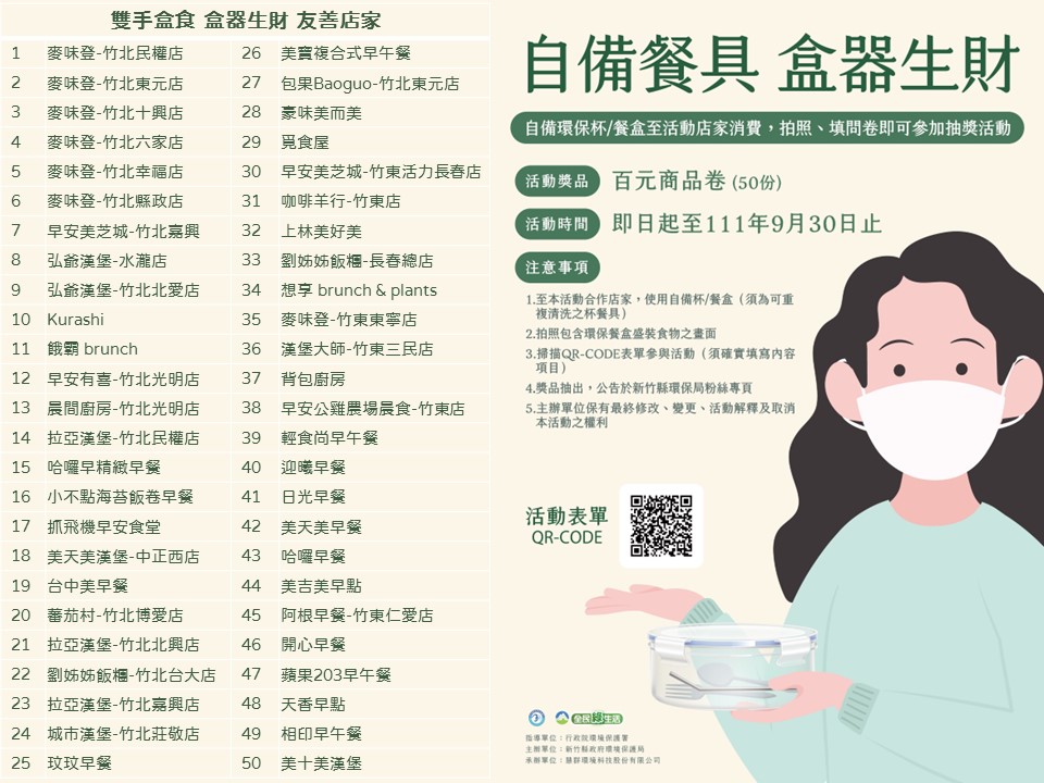 新竹縣環保局積極推動民眾消費自備飲料杯和餐盒,減少使用一次性餐具,特別與轄內早餐、早午餐等友善店家合作,推出「自備餐具 盒器生財」網路抽獎活動,即日起至9月30日止,民眾自備飲料杯或餐盒到友善店家消費,拍照上傳即可參加抽獎,有機會抽中百元商品券,新竹縣長楊文科歡迎大家用實際行動響應環保!