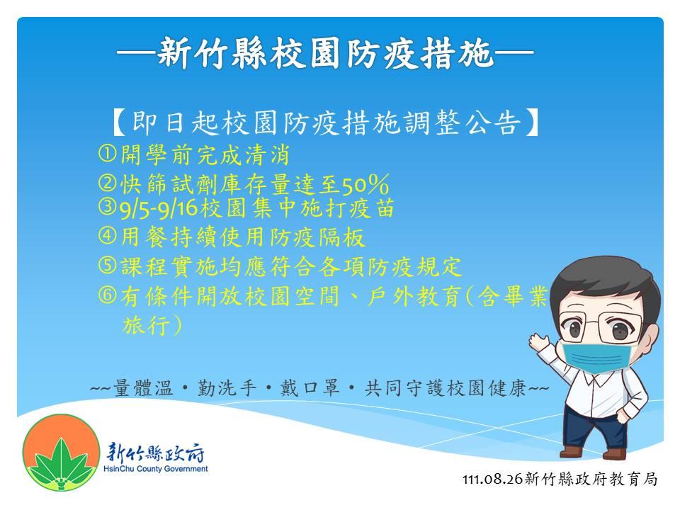 各級學校的新學年即將展開,新竹縣政府已請全縣各級學校皆需做好防疫準備,並在開學前召開防疫小組會議,以及派員到校消毒環境等陸續完成各項準備工作。9月5日起至9月16日,也規劃將安排國小校園集中施打疫苗。新竹縣長楊文科提醒,請師生、家長仍須做好防疫措施,並落實「生病不入校」,以守護你我健康,讓師生能安心上學。