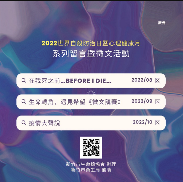國際自殺防治協會(IASP)明訂每年9月10日為「世界自殺防治日」,新竹市響應衛生福利部主題「展現行動 創造希望-打造疫後健康心」,辦理留言徵文活動,即日起至9月30日於竹市社區心理衛生中心網站(https://reurl.cc/V1mDRQ),邀民眾共同分享心聲故事,傳達正面能量!
