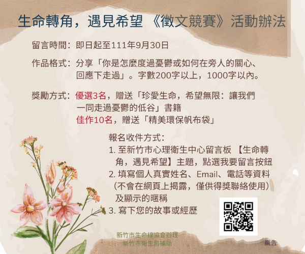 衛生局說明,邀請民眾至「疫情大聲說」看板留言,分享生命歷程;「生命轉角,遇見希望」徵文競賽活動,字數需達200字以上、1000字以內,勇敢分享「如何度過憂鬱或如何在旁人的關心、回應下走過」。活動自即日起至9月30日,至新竹市心理衛生中心留言板點選「我要留言」按鈕,填寫個人真實姓名、EMAIL、電話等資料及顯示暱稱,寫下故事或經歷(個資不會在網頁上揭露,僅供得獎聯絡使用)。