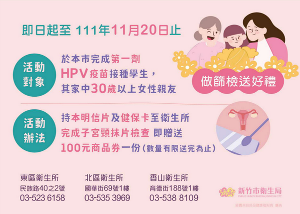 衛生局補充,對於防治HPV有3大關鍵:一、依醫囑接種HPV疫苗。二、安全性行為。三、女性定期作抹片檢查。鑑於子宮頸癌前病變不容易察覺,呼籲女性國民應定期作子宮頸抹片檢查,於今年11月20日前,在本市完成第一劑HPV疫苗學生的30歲以上女性親友,持「守護家人-愛的明信片」與健保卡,在三區衛生所完成每年一次子宮頸抹片檢查,即可獲得100元商品券一份,數量有限。如有疑問可至衛生局網站查詢,或洽三區衛生所諮詢。