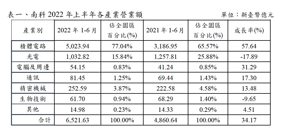 今(2022)年上半年在俄烏戰爭、中國封城、通貨膨脹等全球動盪的氛圍中,南科產業在積體電路產業的領航帶動下,展現無懼逆風的旺盛成長動能,今年上半年營業額(以下同)達6,521.63億元,更創歷年同期新高,大幅成長逾3成(成長率34.17%)以上。