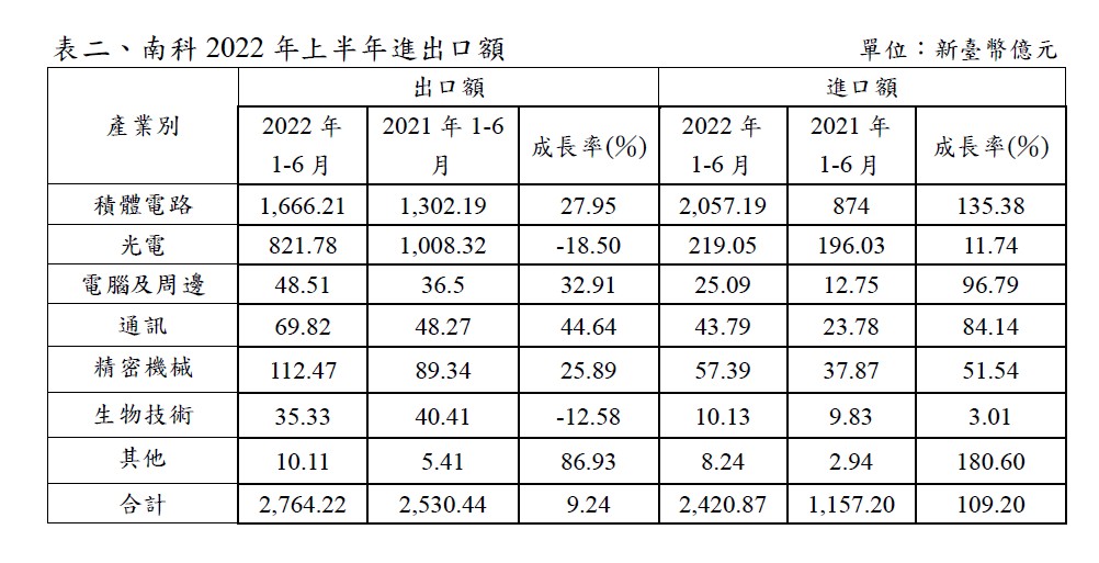 今年上半年南科就業人數為91,683人,較2021年底增加7633人,預估全年員工人數將達9.3萬人。此外,出口金額受惠高效能運算及通訊市場晶片之需求帶動達2,764.22億元,較2021年同期成長9.24%;其中積體電路產業出口金額1,666.21億元為最大宗,占南科出口比重達60.28%,較2021年同期成長27.95%;另今年上半年進口額2,420.87億元,成長達109.20%,係因旗艦大廠持續擴產,進口設備帶動相關需求。