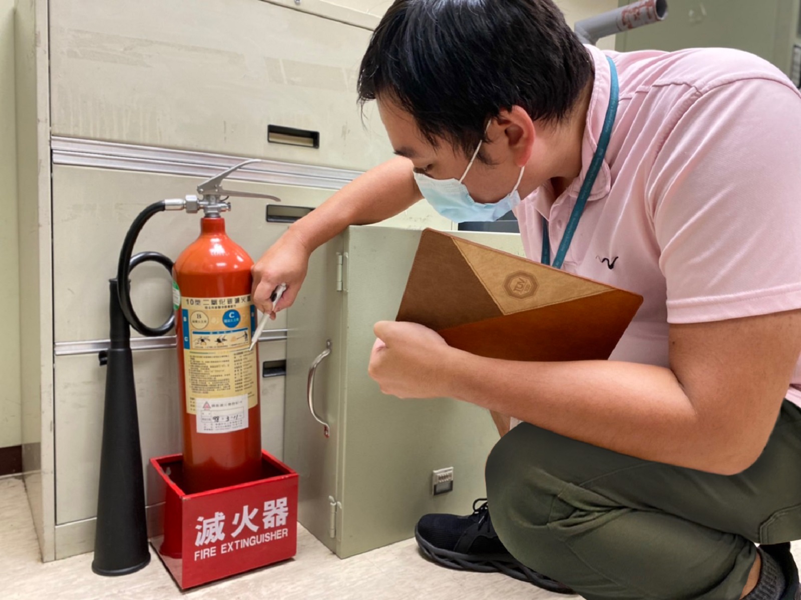 工研院溫室氣體(ISO 14064-1)查證機構人員檢查CO2滅火器的填充日期,確認瓶內溫室氣體逸散量是否合乎標準。