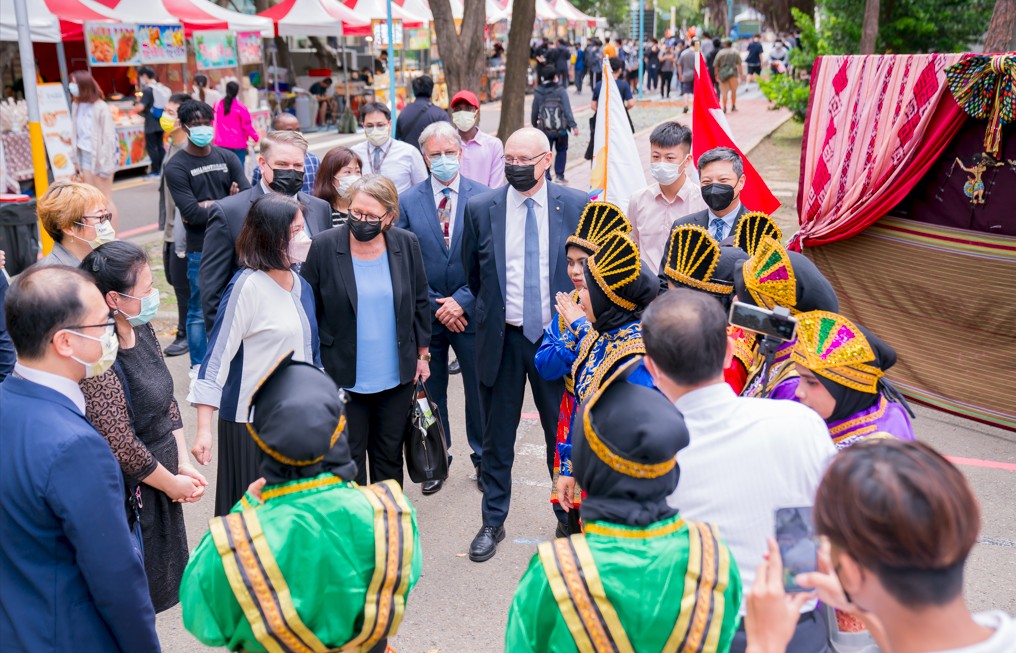 教育部國際司李彥儀司長(左三)出席明新科大56週年的台澳越跨國教育合作MOU簽訂儀式,並參觀國際生市集,印尼學生向司長介紹印尼傳統民俗與服裝。