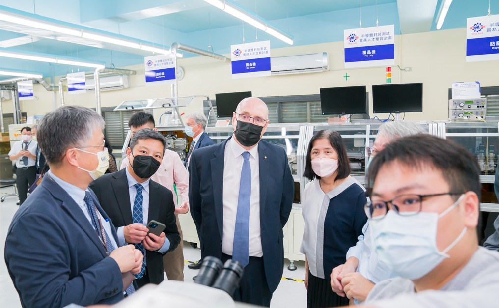 明新科大迎接56週年校慶簽訂台澳越跨國教育合作MOU,李彥儀司長(右二)與澳洲西雪梨大學、越南胡志明市經濟大學等貴賓參觀半導體學院的封裝測試類產線教室。
