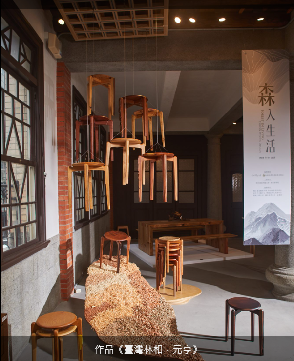 本次展覽亮點包括展場入口處的藝術作品《臺灣林相》,現場吊掛的凳子係依照樹種生長的高度來排列,表達臺灣的森林相貌與生態;而臺灣地圖則是以此17種材料加工過程中產生的鉋花構築而成,代表了臺灣的17個主要的行政區,象徵臺灣係透過多元的文化與生態所組成。