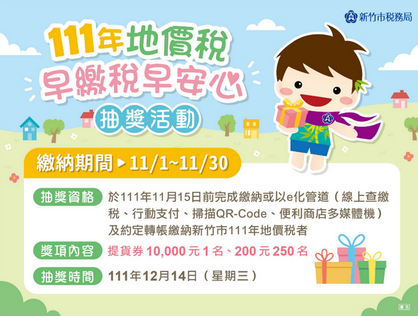 為鼓勵民眾即早繳稅,凡於111年11月15日前完成繳納或於繳納期限內以線上查繳稅系統、行動支付、電子支付、掃描QR-Code、便利商店多媒體機等e化繳稅管道或以約定轉帳繳稅完成納稅款者,就可參加新竹市111年地價稅早繳稅早安心好禮大方送抽獎活動,最高獎項為10,000元提貨券,千萬別錯過!(詳情請上稅務局網站查詢)