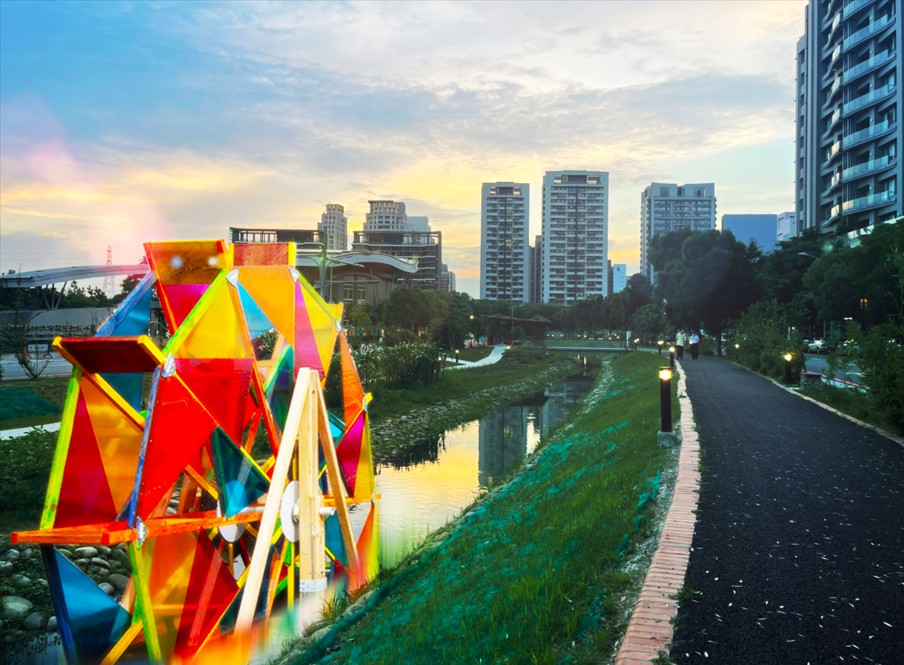 位於公41的「水起Waterwheel 」作品白天與晚上模擬圖,其採用編織藝術以及傳統木工技藝打造而成,輔以LED燈光科技,將作品 化的同時,也讓水道渲染出五彩之姿。 以古早時代用以灌溉農田的水車為裝置概念,這樣的輸水方式來自於古人的腦力激盪,講述著生命力的無限可能。。