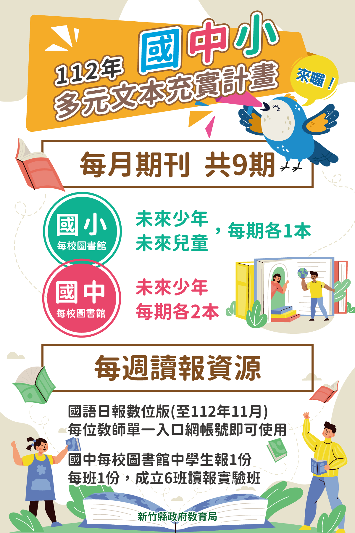 新竹縣政府教育局說明,明年國中小多元文本充實計畫,除了規劃每月提供期刊、國中圖書館每校《未來少年》各2本,國小每校《未來少年》及《未來兒童》各1本外,國中增加每校圖書館及每個班級,每週1份《中學生報》,全縣也將成立6班國中讀報實驗班,加強落實培養核心素養。