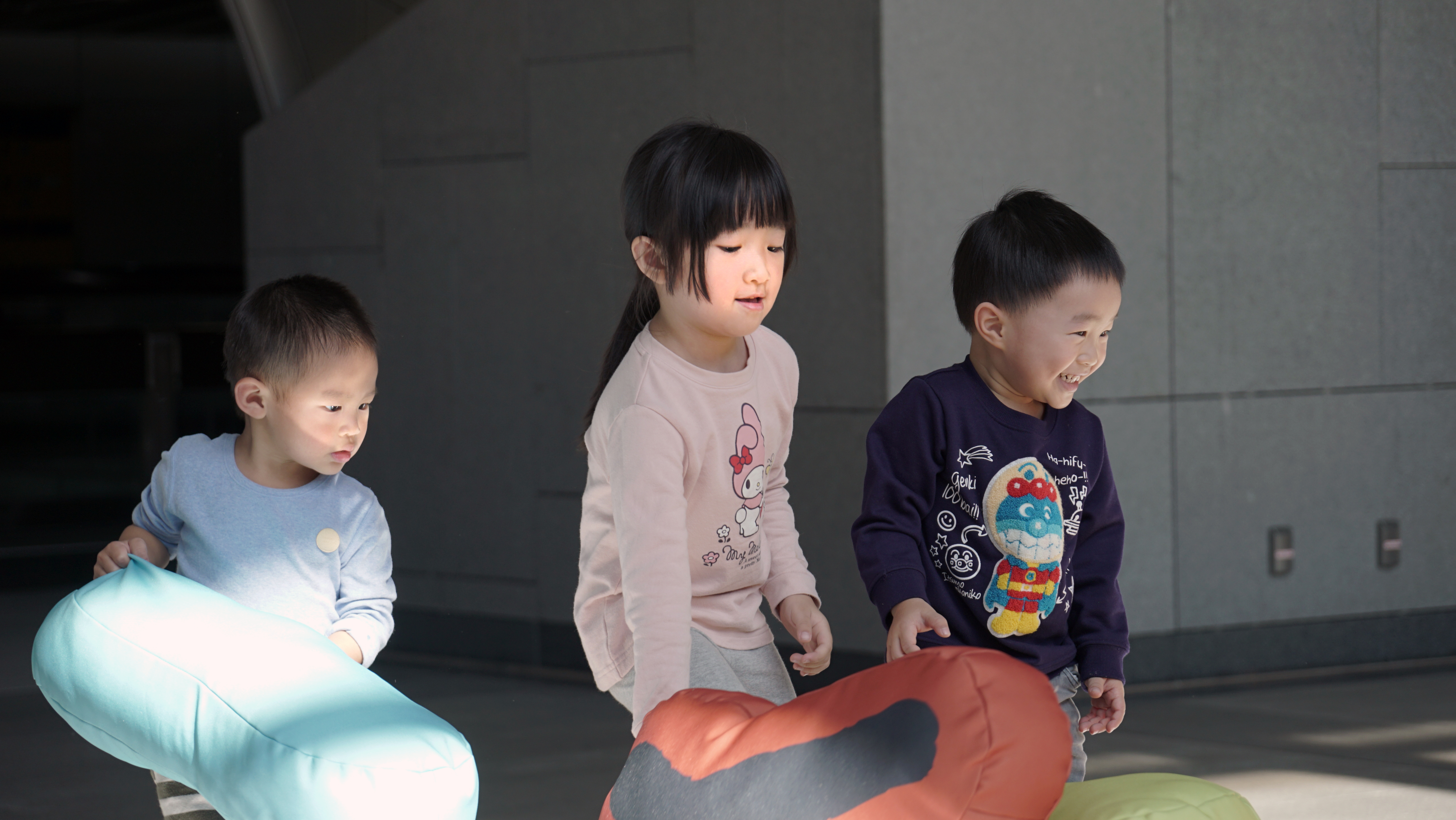 小朋友開心的玩注音抱枕