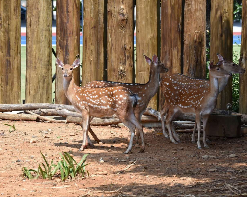 四隻梅花鹿,牠們個性警惕,喜歡群體活動,時常可以看見牠們一起在樹下休息或是走進鵝鴨的水池玩耍,有時候也能看到牠們好奇的站在觀察窗前和遊客大眼瞪小眼,可愛優雅的模樣吸引民眾爭相合照。