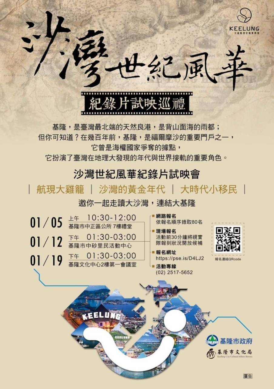 這部全長36分鐘《沙灣世紀風華》紀錄片,是文化部補助『大基隆歷史場景再現整合計畫』子計畫之一,正片分「航現大雞籠」、「沙灣大黃金年代」、「大沙灣小移民」三個主題,並有五段延伸閱讀影片。