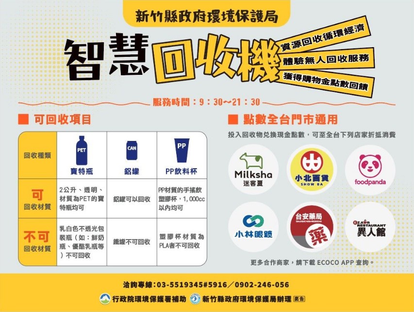 環保局說,歡迎鄉親將清洗乾淨的寶特瓶、鋁罐、手搖PP杯,拿到位於湖口火車站前迷客夏飲料店的「智慧回收機」,民眾只要下載ECOCO循環經濟APP並完成註冊,就可累積購物金點數,回收手搖PP飲料杯可兌換1點,寶特瓶(PET)或鋁罐則可兌換2點,集點能在全台超過40家的配合商店折價使用!