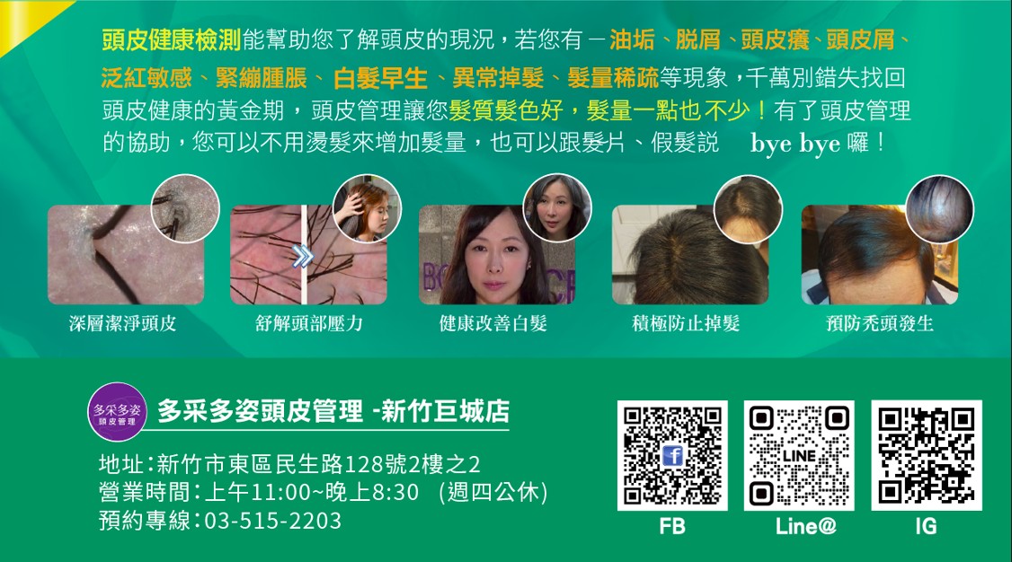 「亞太地區頭皮管理第一品牌」 多采多姿頭皮管理專門店 By 編輯部 - 2023/03/30 13850 台北SOGO忠孝店已成立20年在土城、桃園、中壢、楊梅等地區設有「多采多姿頭皮管理專門店」,2023年3月12日大新竹地區已迎來「多采多姿頭皮管理·新竹旗艦店」,有任何頭髮頭皮問題歡迎私訊詢問,追蹤我們帶你認識、改善頭皮問題!門店地址:新竹市東區民生路128號2F之2(巨城商圈)營業時間:11:00am ~ 08:30pm, 週四店休聯絡電話:03-5152203FB粉絲頁LINE@IG 頭髮頭皮問題頭皮健康檢測多采多姿頭皮管理新竹旗艦店 延伸閱讀 「亞太地區頭皮管理第一品牌」 多采多姿頭皮管理新竹旗艦店慶開幕