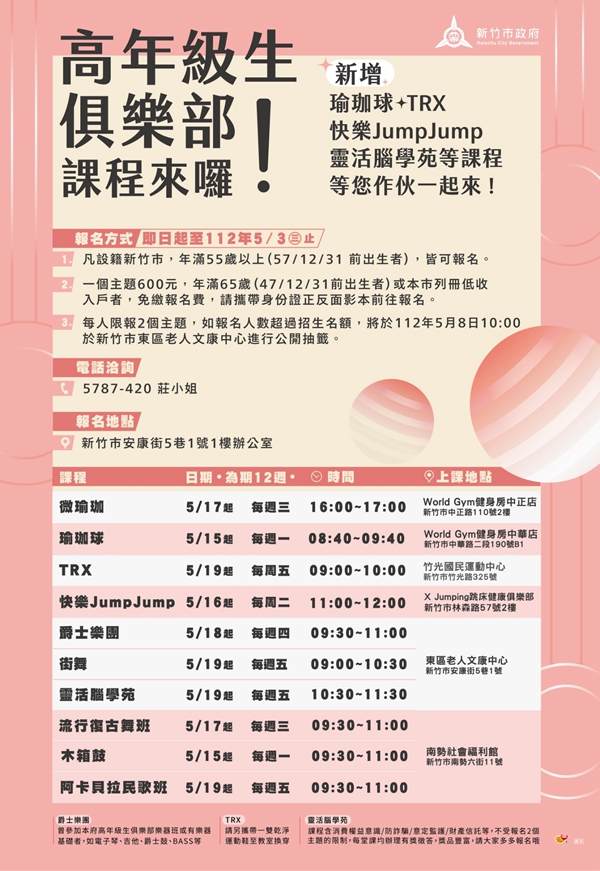 為照顧高齡長輩,豐富爺奶們的退休生活!廣受長輩們喜愛,叫好又叫座的「高年級生俱樂部」系列課程即日起開始受理報名。社會處表示,今年「高年級生俱樂部」共規劃10班,課程內容十分多元豐富,除了爵士樂團、街舞、流行復古舞班、木箱鼓、阿卡貝拉民歌班、微瑜珈等既有活動外,今年更新增瑜珈球、TRX、快樂JumpJump與靈活腦學苑等多元課程,歡迎竹市爺爺奶奶們踴躍參與,共同展現青春活力。