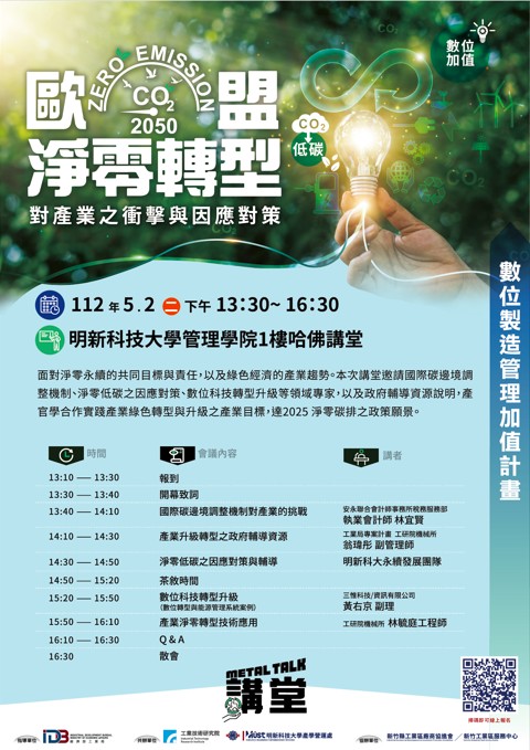 面對全球淨零碳排趨勢,為協助中小企業邁向減碳第一步,由經濟部工業局指導,明新科技大學產學營運處、財團法人工業技術研究院、新竹縣工業區廠商協進會及新竹工業區服務中心合作,將於5月2日下午在明新科技大學管理學院1樓哈佛講堂舉辦「Metal Talk講堂:歐盟淨零轉型對產業之衝擊與因應對策」的說明會,協助桃竹苗地區廠商了解歐盟淨零政策、法規及政府提供的輔導源等,協助中小企業減碳能力及低碳轉型,實踐政府宣示的2050年淨零碳排政策願景。