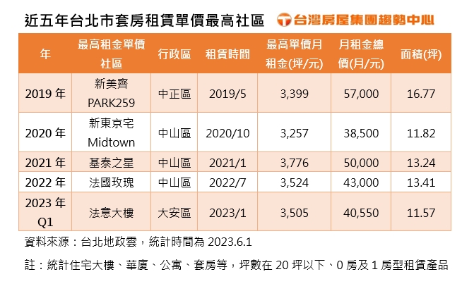 進一步觀察近5年台北套房租賃交易,包括新美齊PARK259、新東京宅Midtown、基泰之星,法國玫瑰等,都屬於高租金社區,租金單價都在3200元以上。其中又以2021年租賃的中山區「基泰之星」六樓戶,13.24坪,月租金5萬元,以單坪3776元成為近五年新高,若以社區近一年成交均價75~85萬元計算,投報率約5~6%。