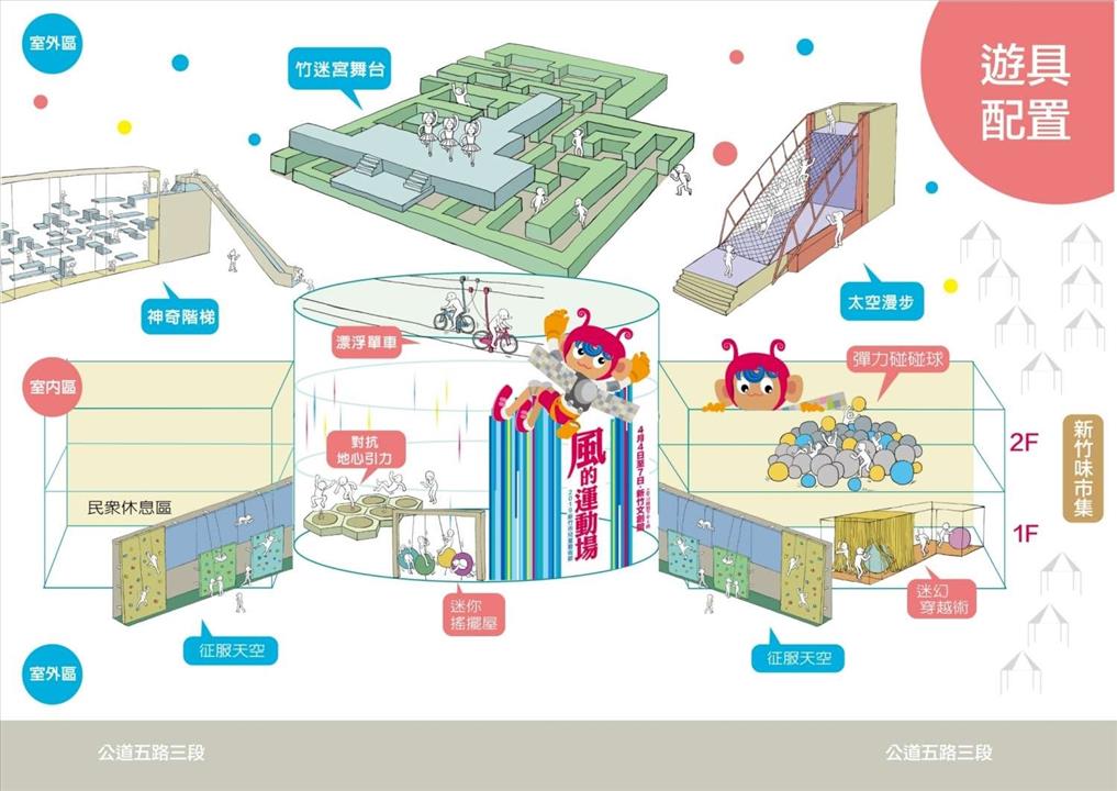 今年遊具設計上結合文創館建築本體,規劃了9大遊具,包含竹迷宮舞台、神奇階梯、太空漫步、征服天空、漂浮單車、對抗地心引力、迷幻穿越術、彈力碰碰球及迷你搖擺屋;其中「太空漫步」是大型攀爬繩網,突破以往推出更陡峭的路徑,讓孩子透過攀爬網手腳並用,抵達文創館3樓,還能眺望整個竹迷宮舞台;「征服天空」則是配合文創館建築體設置的攀岩體,打造不同高度的牆面,讓大小朋友從中訓練肢體協調性、培養體力與勇氣。