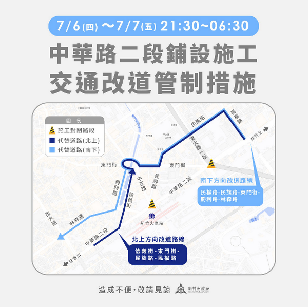 新竹市工程大力推進中!中華路二段人行環境改善工程即將完工,市府7月2日公布全工區道路瀝青混凝土刨鋪工程期間交通管制資訊,預計7月4日至7月7日將進行夜間施工(21:30至翌日6:30),採汽、機車道全線封閉,提醒用路人預先減速慢行、提前改道。
