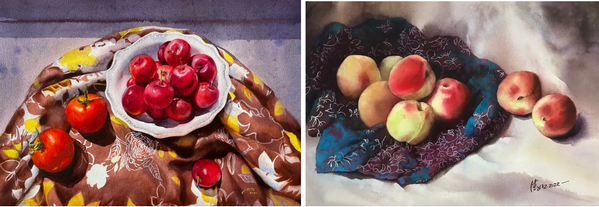 圖左-藝術家楊祝菁作品《饗宴》。 圖右-藝術家黃德如作品《五月的水蜜桃》。