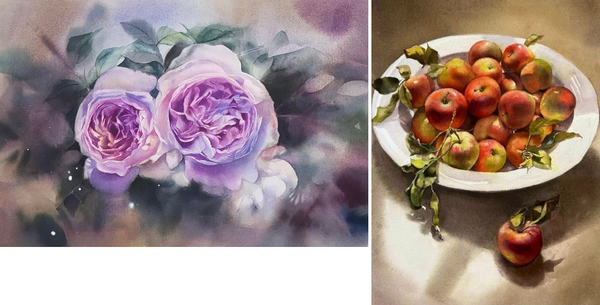 圖左-藝術家黃玲瑩《紫色玫瑰》。 圖右-藝術家王雪玲《午後的陽光》。