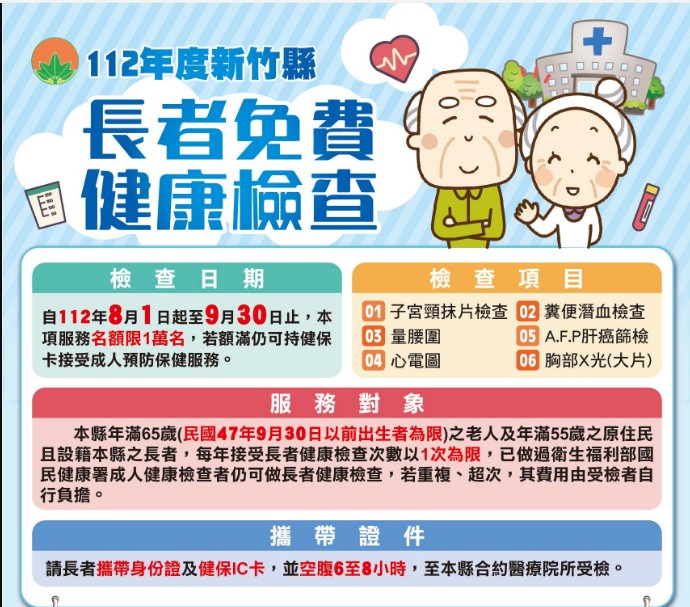 新竹縣長楊文科表示,縣府積極提昇新竹縣整體的醫療水準,採取垂直、水平整合縣內醫療資源,並辦理及推動高齡友善城市計畫等。本次免費健康檢查將依各醫院分配人數,限額1萬人辦理,目前尚有名額,檢查辦理期間至9月30日止,請符合受檢資格的長輩逕向各新竹縣政府簽約之醫院洽詢辦理。