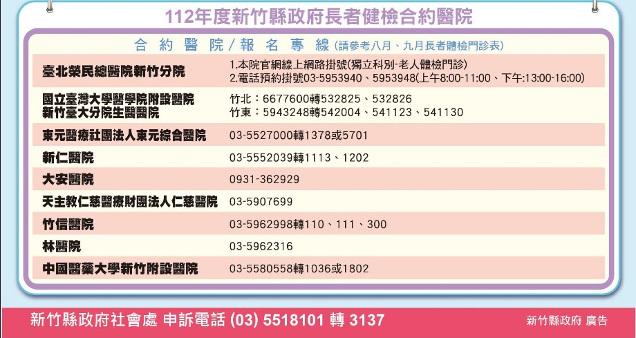 縣府社會處指出,今年縣府委託的醫院計有榮民總醫院新竹分院、台大醫院竹東分院、東元醫院、新仁醫院、大安醫院、仁慈醫院、竹信醫院、中國醫藥大學新竹附設醫院及林醫院等9家醫院;健檢項目包括胸部X光、心電圖、A.F.P肝癌篩檢、子宮頸抹片檢查、定量免疫法糞便潛血檢查(IC85)及量腰圍等。